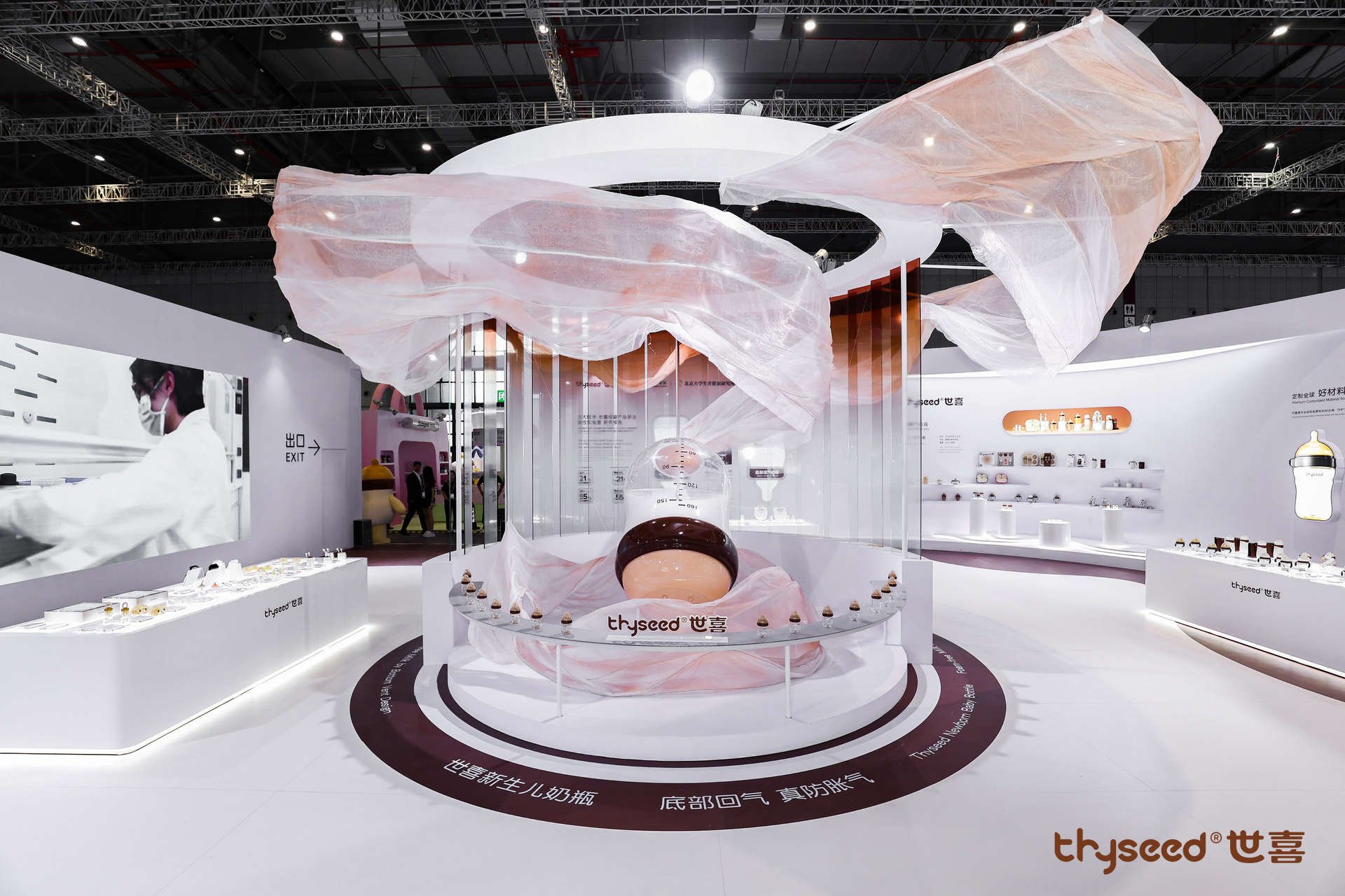 在CBME世喜品牌展馆的核心位置,一座放大版新生儿奶瓶艺术装置格外引人注目。世喜以雕塑的形式,将品牌核心科技直观呈现。整体设计中,丝带般的柔纱幕带贯穿瓶底,形象还原了奶瓶“底部回气”结构中空气流通的路径,清晰可视化了回气过程的运作原理:空气从瓶底回气阀顺畅进入,避免接触奶液,不产生气泡,从而有效守护宝宝每一口的纯净与安心。
